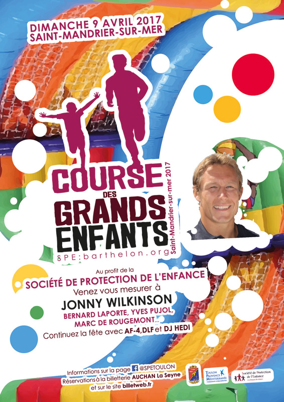 Dans cet esprit l’association lance la première édition de la « course des Grands Enfants » le 9 Avril 2017 à Saint-Mandrier-sur-mer : le parrain en est Jonny Wilkinson qui, par amitié, fera le voyage d’Angleterre pour courir les 5 km prévus.