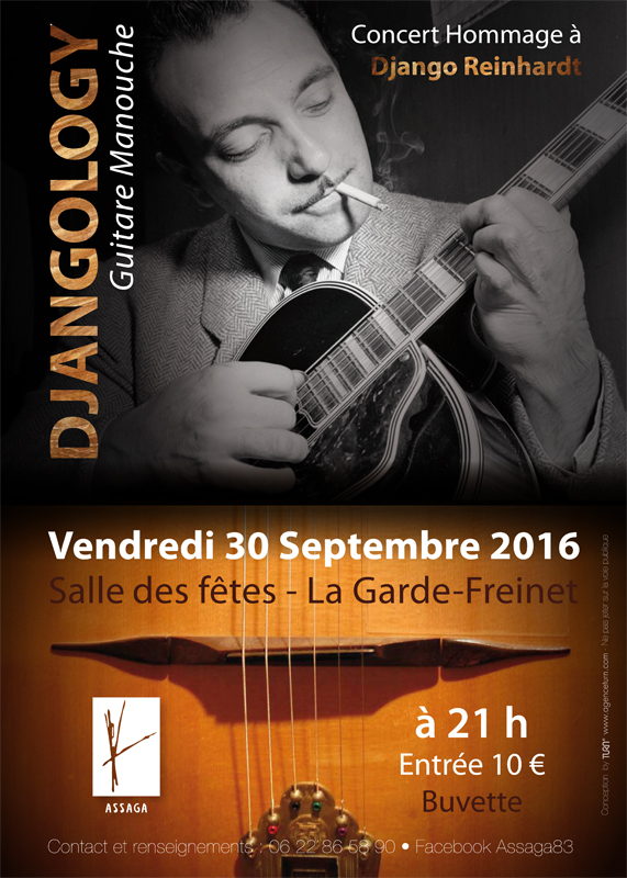 <h2>Djangology</h2> Guitare manouche Concert hommage à <strong>Django Reinhardt</strong> Vendredi 30 septembre 201 à 21h Salle des fêtes de <strong>la Garde-Freinet</strong> Entrée 10€ Buvette Renseignements : 06.22.86.58.90 ou Facebook Assaga83