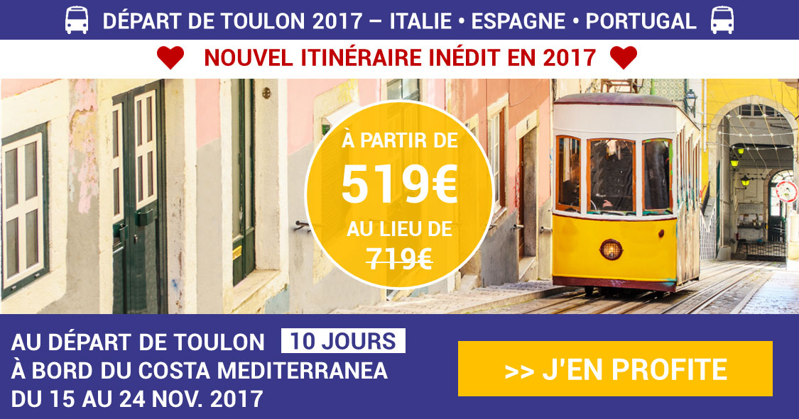 AU DEPART DE TOULON Réservez votre croisière de 10 jours à partir de 519€/personne avec CapCroisieresVoyages et info83 ! Naviguez jusqu’à Lisbonne au Portugal à bord du Costa Mediterranea du 15 au 24 Novembre 2017. Demandez un devis gratuitement au 04 98 01 64 64 ou sur www.capcroisieres.com