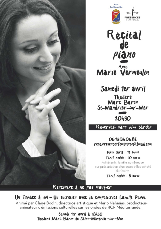 Vous pourrez notamment retrouver un RECITAL DE PIANO avec Marie VERMEULIN.