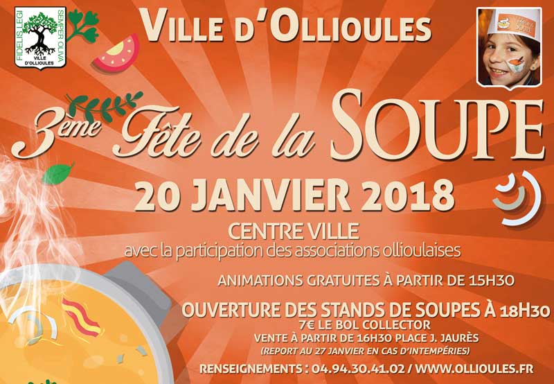 Pour la troisième année consécutive la ville d’Ollioules et les associations ollioulaises vous donnent rendez-vous à la Fête de la soupe pour déguster des soupes gourmandes et inventives.