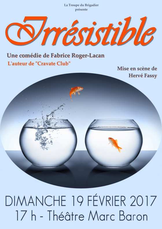 Avec Irrésistible, Fabrice Roger-Lacan signe une comédie cruelle et drôle. Son texte ciselé décortique de façon originale et cocasse les mécanismes d’une jalousie peu ordinaire. Bref, une comédie à l’humour irrésistible.
