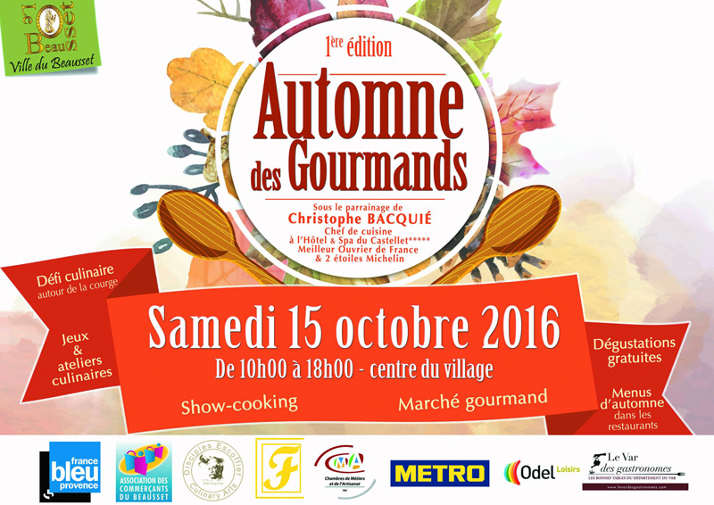 Sous le parrainage de Christophe Bacquié, chef de cuisine à l’hôtel du Castellet et Spa *****, meilleur ouvrier de France et 2 étoiles Michelin et en partenariat avec l’association des commerçnts du Beausset, France Bleu Provence, les Disciples d’Escoffier, le Comité Officiel des Fêes, la chambre des Métiers et de l’Artisanat, Métro, l’Odel Var et ‘‘Le Var des Gastronomes’’.
