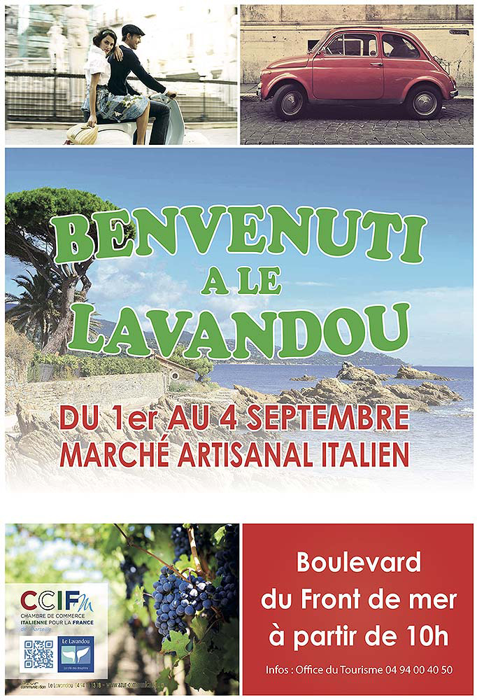Marché artisanal italien Benvenuti a le Lavandou Du 1er au 4 septembre 2016 Boulevard du Front de mer à partir de 10h Infos : Office du Tourisme 04.94.00.40.50 INFO83, toute l'actualité du Var ! Suivez-nous sur les réseaux sociaux !