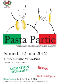 <font size='8'><strong><span style='font-size:12.0pt;font-family:<br>Times;mso-fareast-font-family:Times-Roman;mso-bidi-font-family:'Times New Roman';<br>color:black;mso-ansi-language:FR;font-weight:normal;mso-bidi-font-weight:bold' lang='FR'><font style='font-family: Arial,Helvetica,sans-serif;' size='4'>Samedi 12 mai : <br>Pasta Partie, repas italien et animation musicale, proposée par le Comité de jumelage La Londe / Galbiate, à 19h30, à la salle Yann-Piat (15).</font><br></span></strong><strong><span style='font-size:12.0pt;font-family:Times;mso-fareast-font-family:Times-Roman;<br>mso-bidi-font-family:'Times New Roman';color:black;mso-ansi-language:FR;<br>font-weight:normal' lang='FR'></span></strong></font><br><br>
