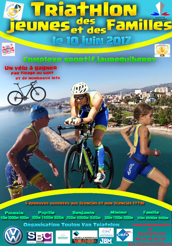 Le samedi 10 juin prochain notre club de Toulon Var Triathlon organise avec et en coopération avec la Marine Nationale, la municipalité de Toulon, le 1er Triathlon des jeunes et des familles qui se déroulera sur le complexe sportif Jauréguiberry, avec le label grand prix régional jeune délivré par la FEDERATION FRANCAISE DE TRIATHLON.
